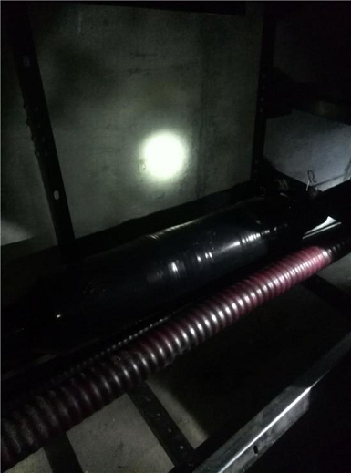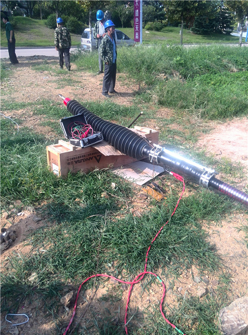 經過測距設備檢測故障位置距離測試端30米。設備再次加壓,在故障位置明顯看到有燃弧現象,定位完畢。